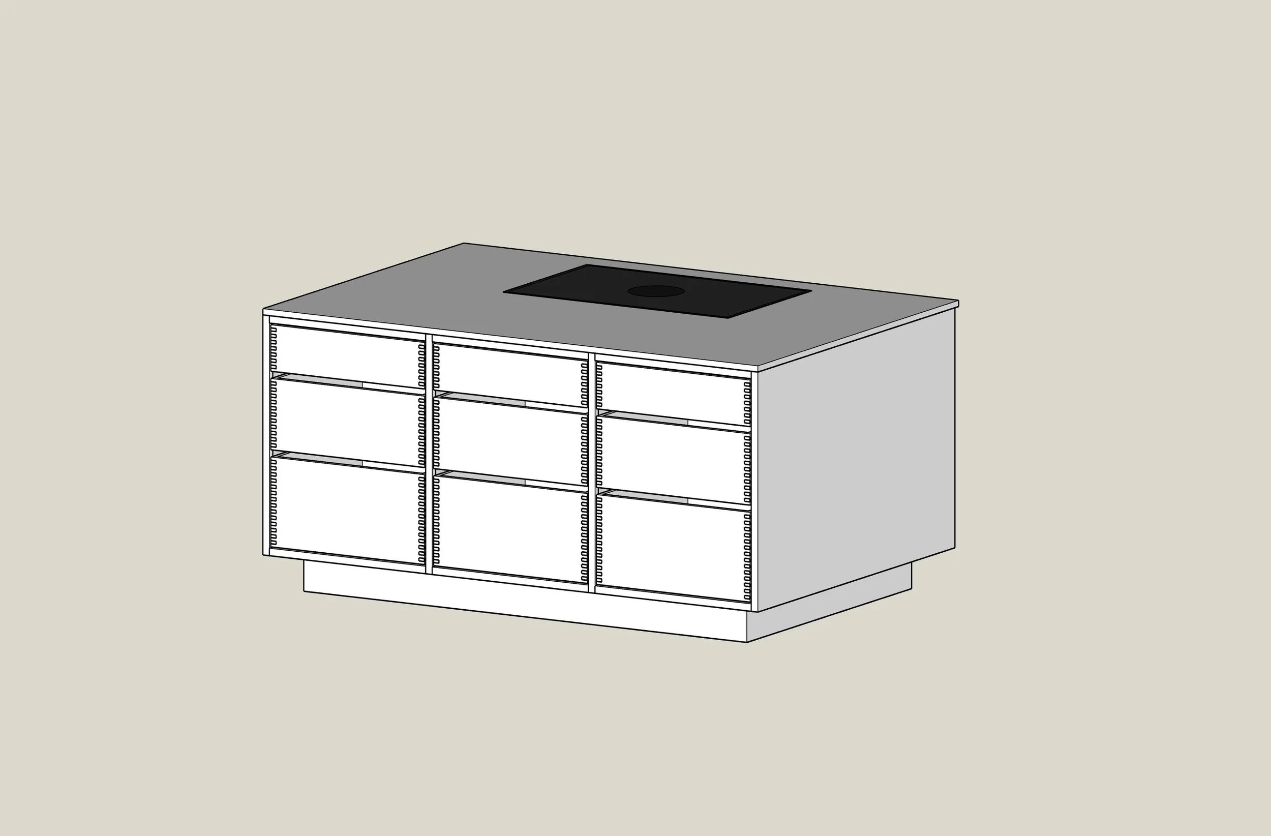 Køkkenøen består af 6 underskabe med skuffer, inklusiv sokkel og gavle. Elementerne er fremstillet efter mål og udført med de karakteristiske rammefronter, som kendetegner Thorsó-serien.