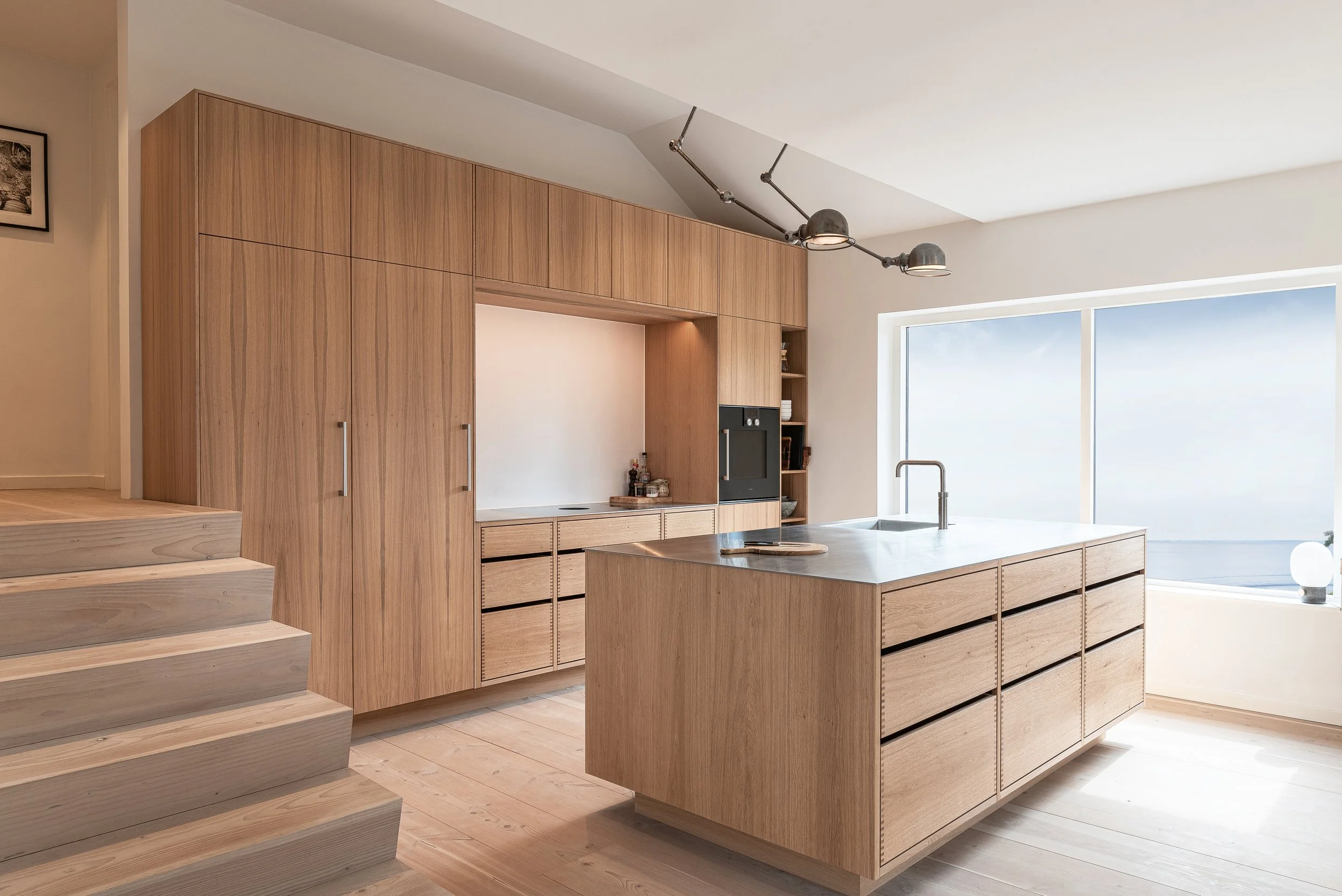 Højskabsvæggen giver god opbevaringsplads og mulighed for at integrere hvidevarer i et roligt og sammenhængende udtryk.