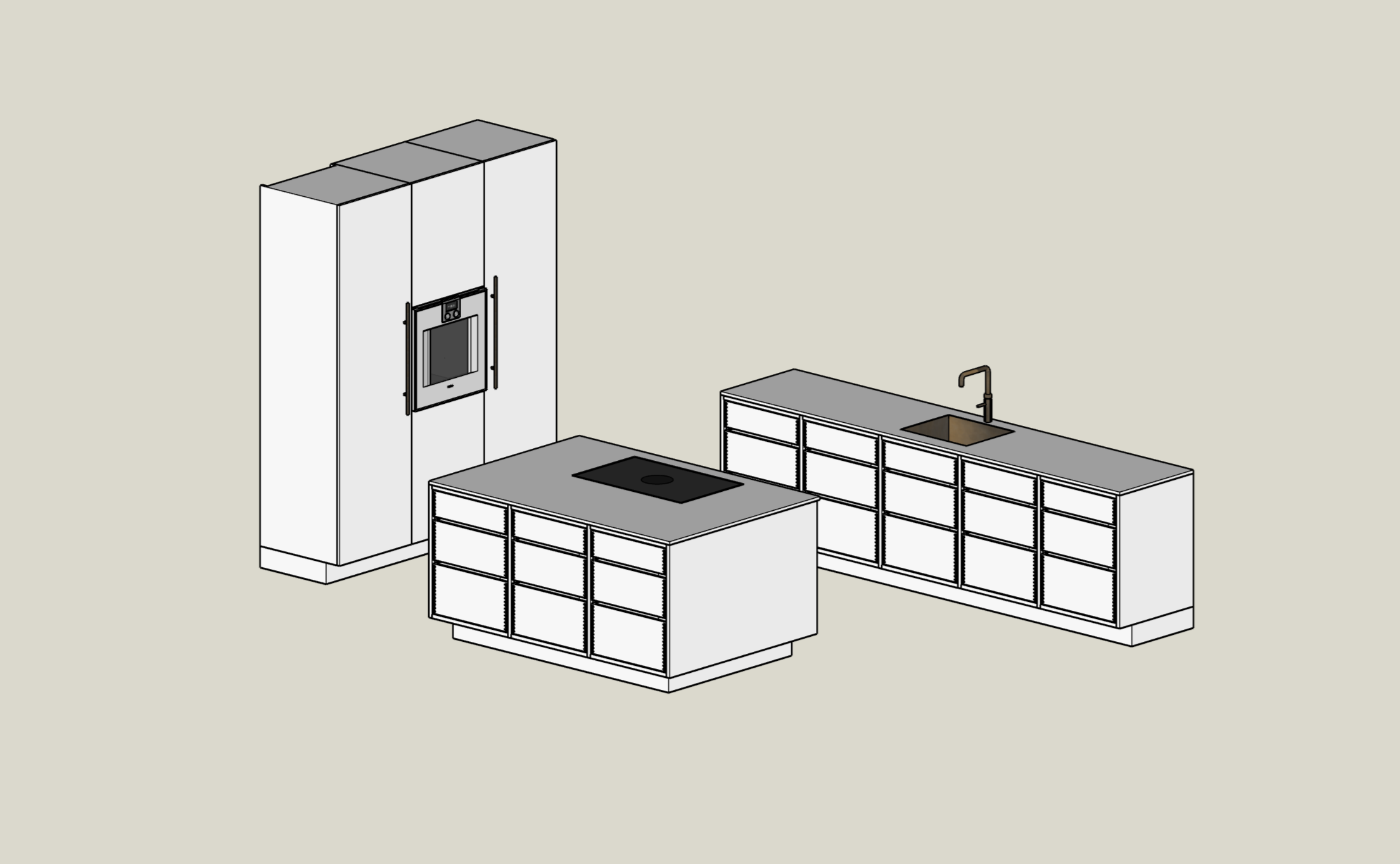 Køkkenet består af 5 underskabe med skuffer, inklusiv sokkel og gavle. Alle elementer er fremstillet i massivt egetræ med gennemgående åreforløb, hvilket giver et roligt og eksklusivt udtryk, hvor træets struktur fortsætter harmonisk på tværs af fronter.